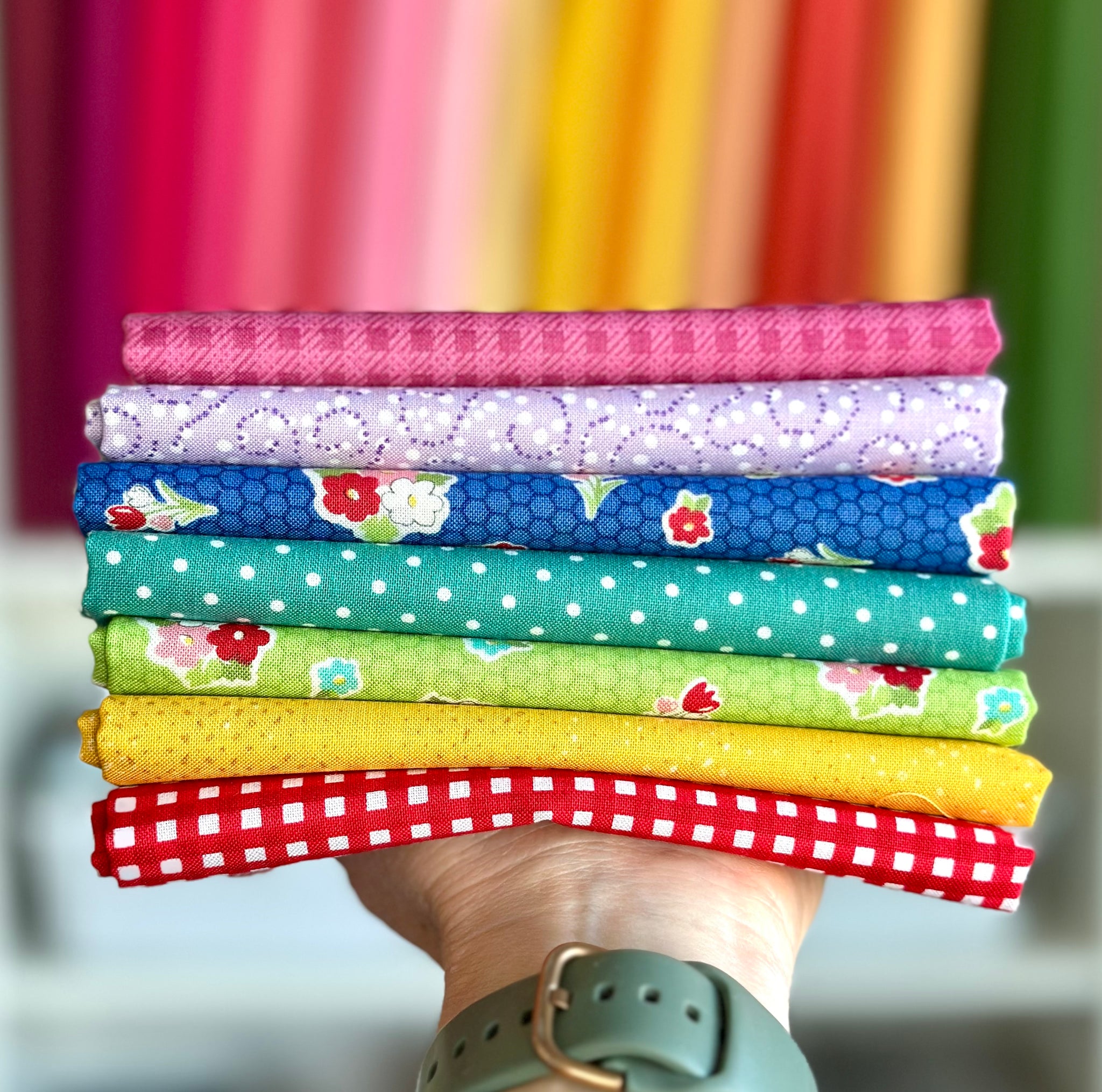 Fabric is a custom curated bundle of quilt shop quality prints. Background fabric is Riley Blake Confetti Cotton Solid in white.